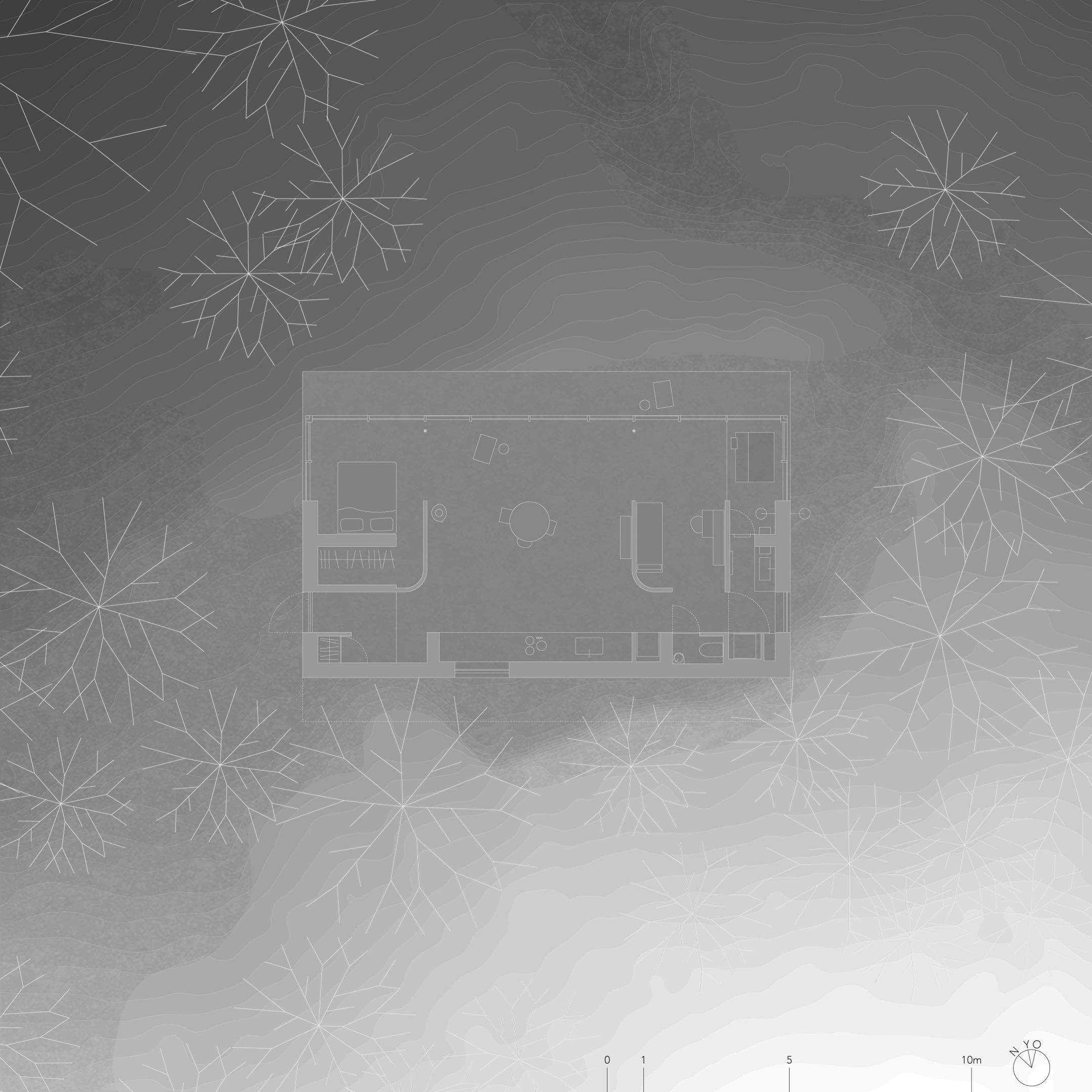 We propose a “rock-roof hybrid”. As if someone had carved the inside of a large rock and for some reason meticulously chiseled its top into an archetypical roof, Villa T is both open and solid at the same time.